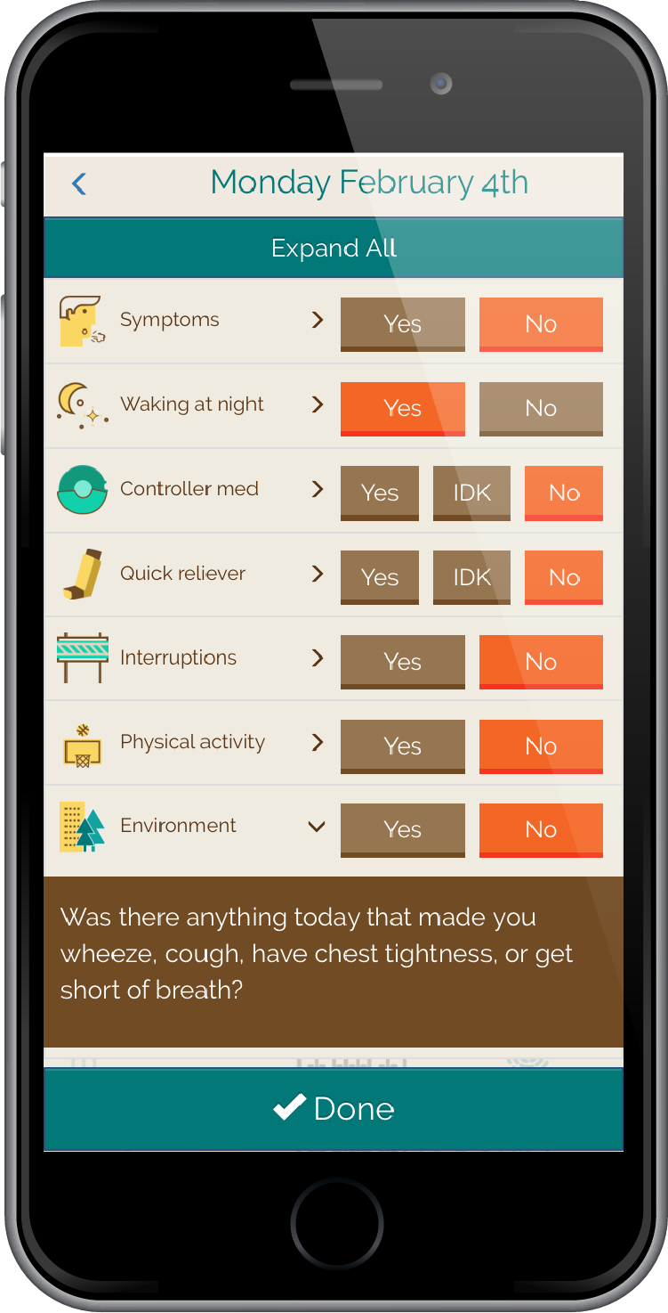 The CAMP Air checklist was developed to encourage teens with asthma to daily track their symptoms, triggers, and medication use in an engaging and convenient format. The checklist app is available for iOS and Android devices. Users can view and share a weekly report with their parents and healthcare providers.